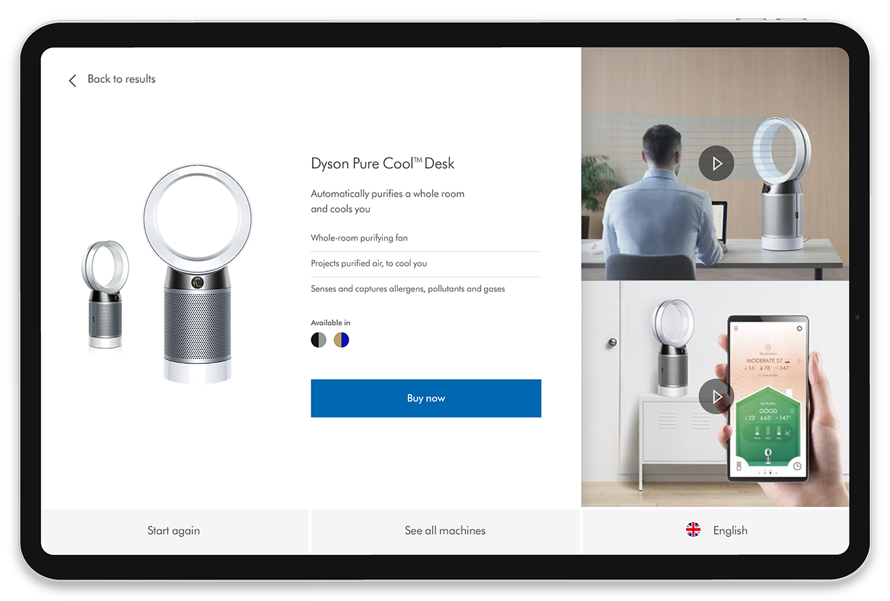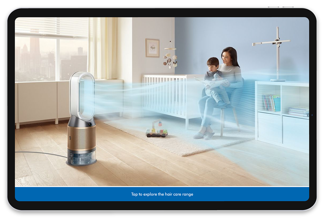 At the core of the experience is a series of interactive tablets integrated into merchandise fixtures. Customers can physically interact with Dyson products, then seamlessly transition to the touchscreen to explore deeper product features and information. This creates a continuous loop between touching, learning and deciding, turning the fixture into a self-service sales tool.
