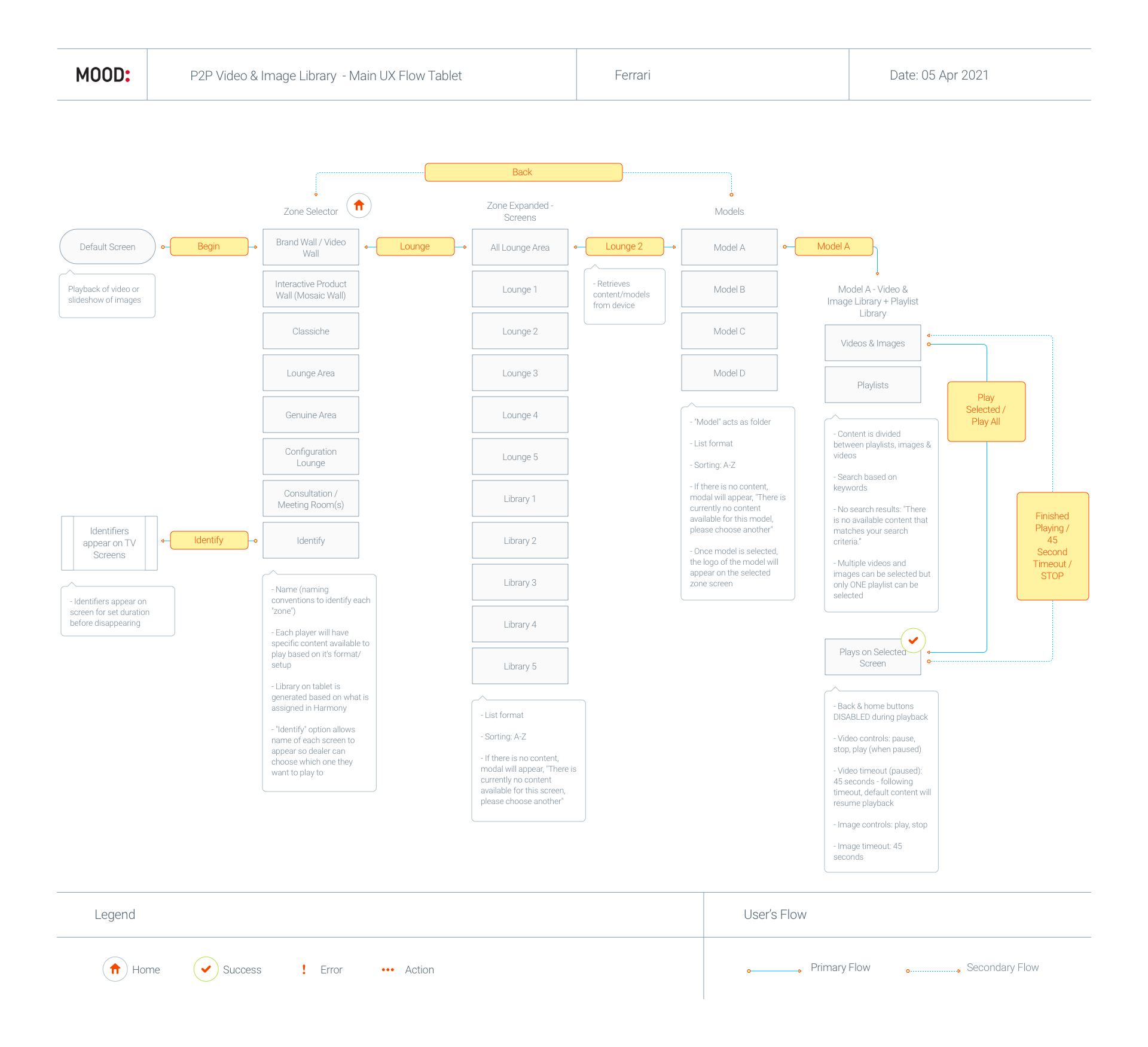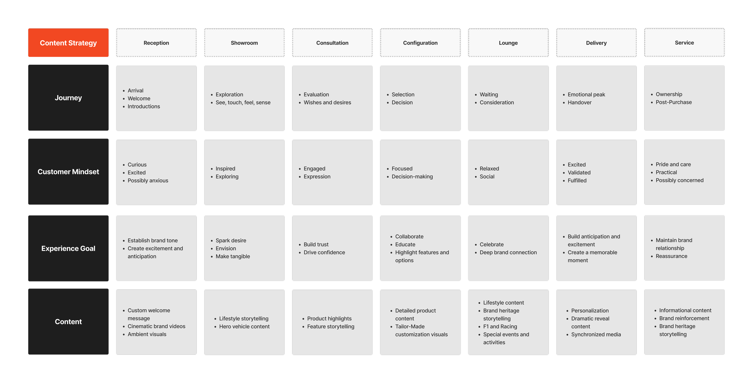 We mapped the end-to-end dealership journey to understand how customers think, feel and make decisions at each stage of the sales process. These insights informed a content strategy tailored to each zone, ensuring digital media enhances key moments without disrupting the experience. We then audited Ferrari’s existing visual assets, curating and adapting content for tailored playlists in each zone.